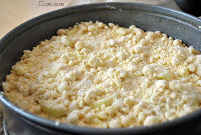 Dann die Streusel aus dem Kühlschrank und über den Äpfel verteilen: